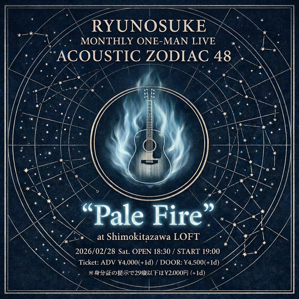龍之介マンスリーワンマンライブ 「ACOUSTIC ZODIAC 48 "Pale Fire"」 会場:下北沢LOFT 18:30開場/19:00開演 前売4000円/当日4500円 (共に+1drink) ※身分証の提示で29歳以下は2000円 (+1d) ■ご予約は各SNSのDM、かんたん予約フォーム またはこちらのメールアドレスにて承ります。 ⇒unbalance@ryu-web.jp (龍之介事務所アンバランス) ※日付・枚数・予約名を記載してください。
